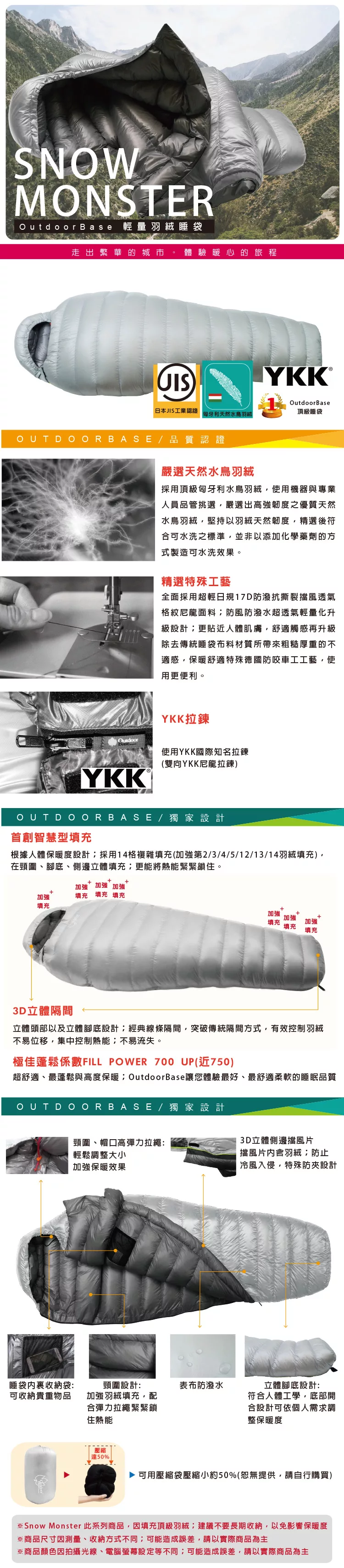 商品推薦:【Outdoorbase】Snow Monster-頂級羽絨保暖睡袋 FP700+UP 800g 極輕量羽絨睡袋 24691(太空灰-中灰)